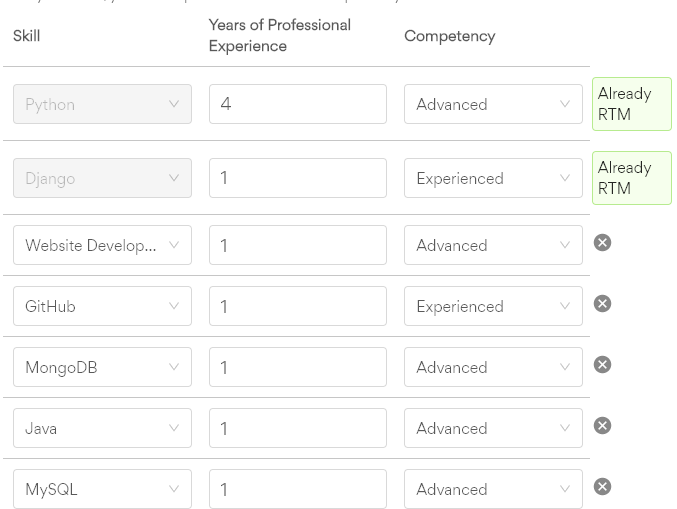 오른쪽의 편집 아이콘을 누르면 각 스킬을 추가/삭제 할 수 있고 경력기간과 능력수준을 수정할 수 있다. 업로드한 이력서가 아닌 프로필 에서 작성한 Work history , side project 등에서 입력한 키워드를 기반으로 자동 생성된다. 잠깐 언급한 것도 모두 추가되니 경력 1년 미만의 키워드(스킬)은 삭제하는 것이 좋다.