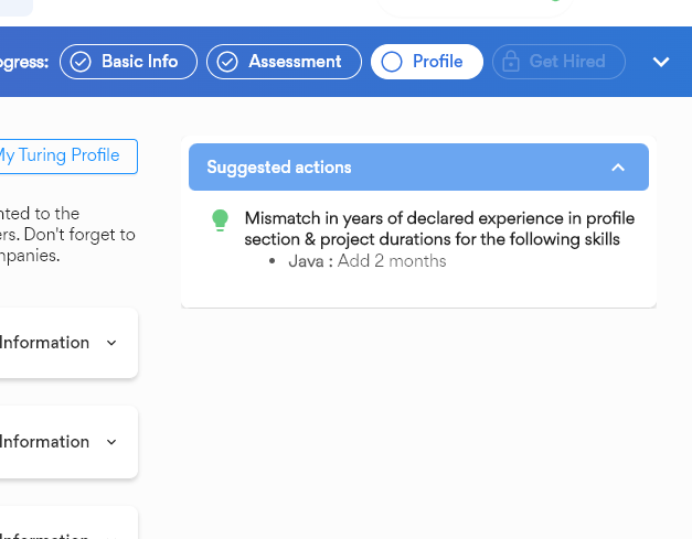 기술(키워드)와 경력기간이 일치하도록 작성되었다면 위와같이 대부분의 필요/제안 사항은 사라지고 Home 화면의 Profile Completion 항목이 채워져 있음을 확인할 수 있다. 필자는 오늘 비기술적 전화평가가 예정되어있으므로 무사히 통과한다면 Profile항목이 100퍼를 찍을 수 있지 않을까?!