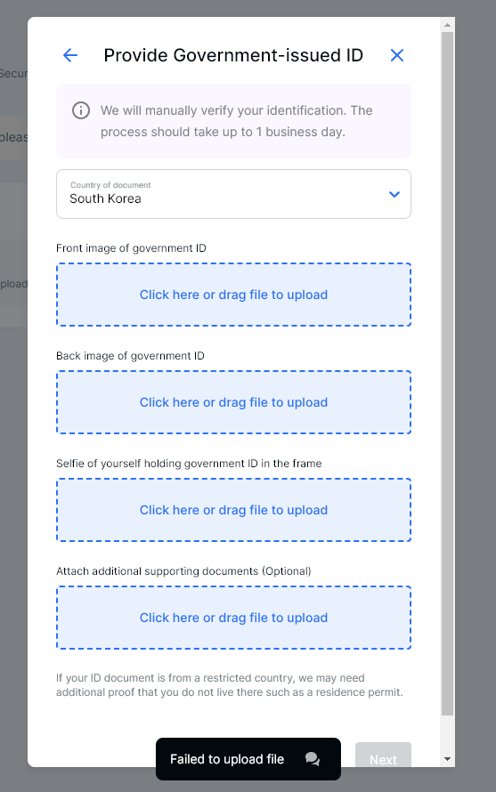 하려면 신분증이 필요합니다. 저는 신분증을 촬영하면 될 줄 알았는데, 한국인에 대해서는 신분증으로 자동 신원확인이 안된다고 나오더라구요. 헐.. 그래서 고객센터에 문의했더니, 친절하게 Manual Verification 방법을 안내해주었습니다.
