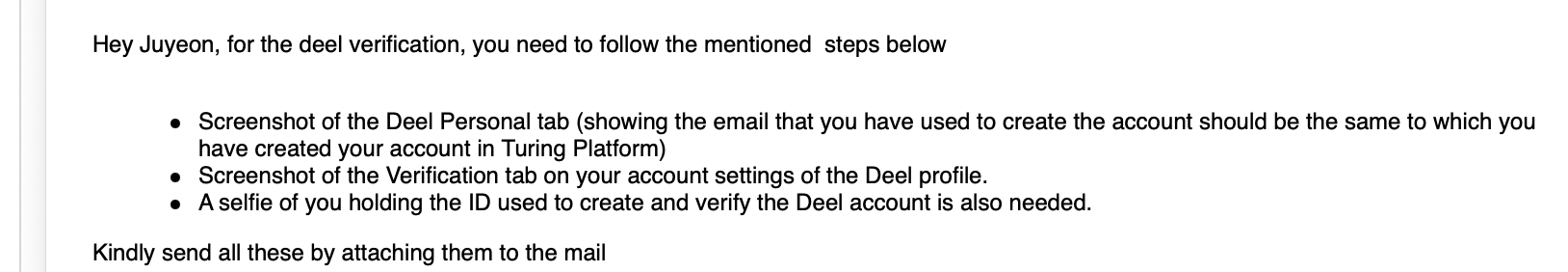 튜링에서 비기술적 평가전화를 받고나면, letsdeel.com 에 회원가입하라는 메일이 도착합니다. 메일 내용에서는 deel verification (사이트 내 신원확인)을 진행한 후, 메일로 3가지 사진파일을 전송하라고 적혀있었습니다.