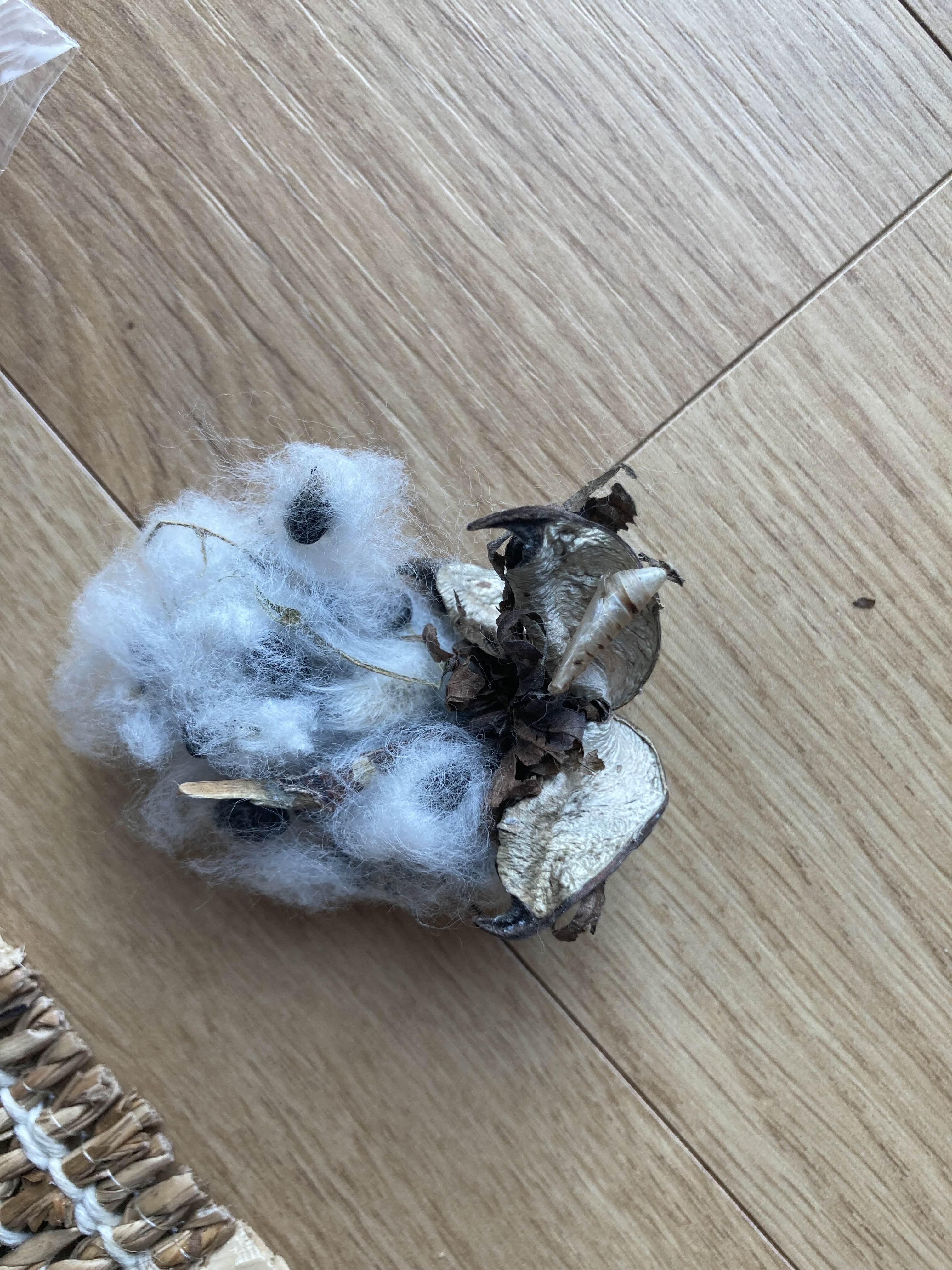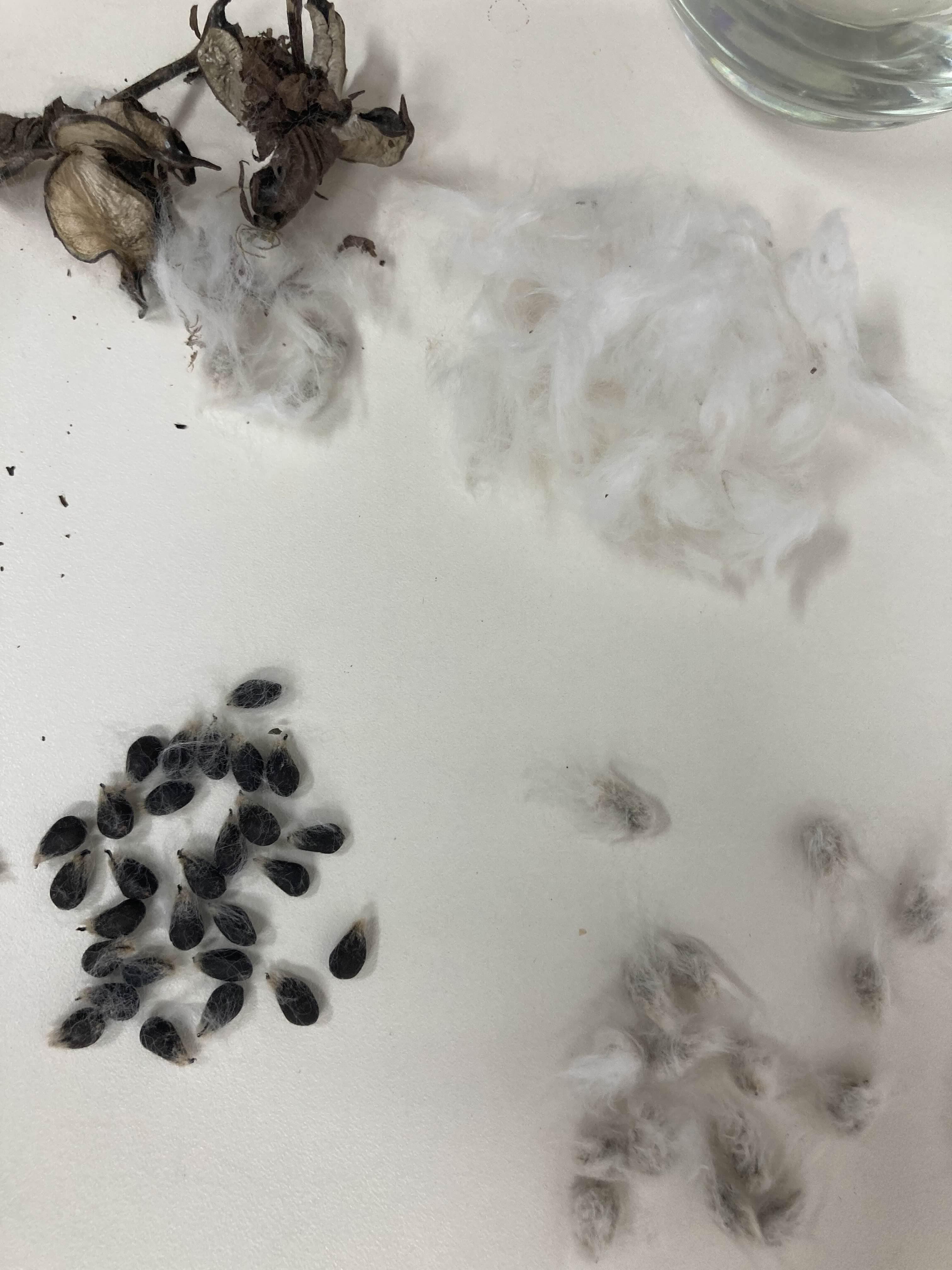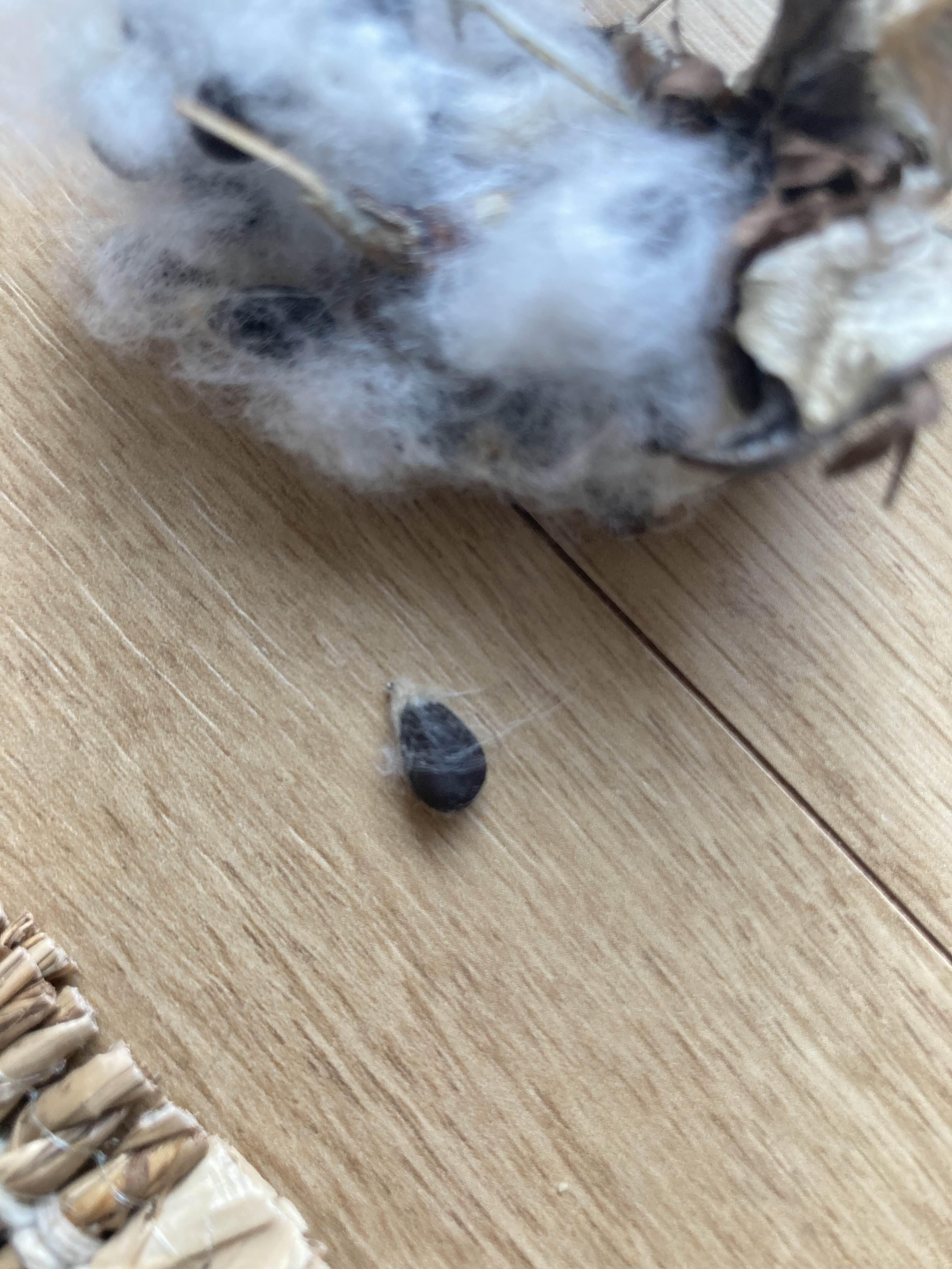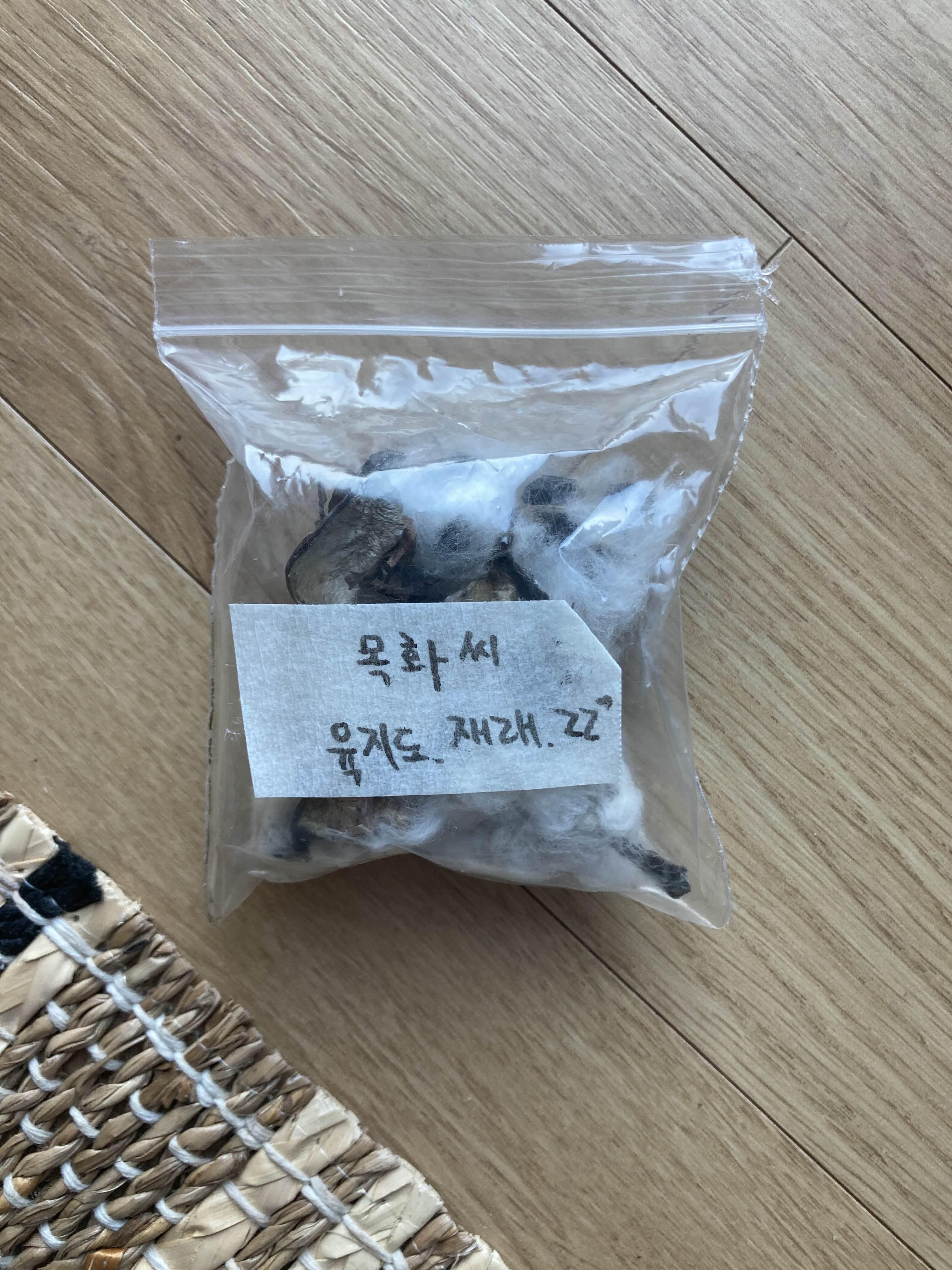 목화씨 채종된 모습. 솜은 대충 뜯어냈어서 약간의 솜과 씨앗이 붙어있다.