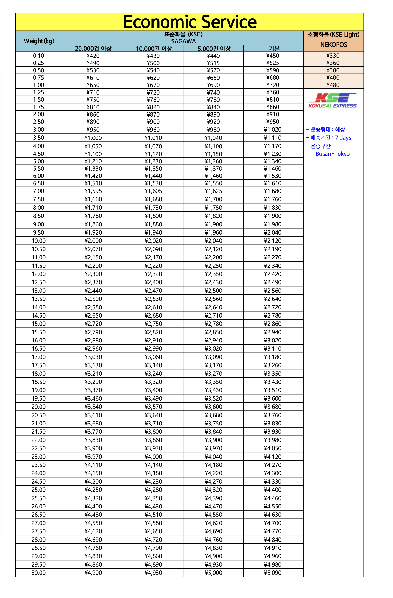 배송비가 원가의 상당 비중을 차지하는 구조라서 KSE( https://www.kokusaiexpress.com/)에 문의를 하게 되었고, 아래와 같은 요율표를 받았다.