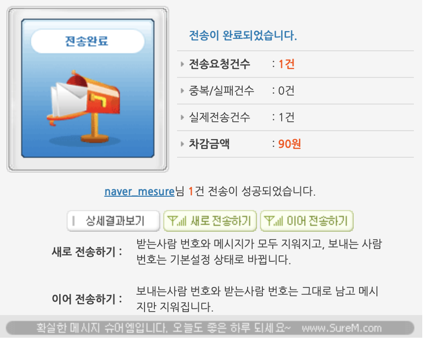 저는 슈어엠이라는 업체를 이용했습니다. 이전에 개발자로 근무할 때, 슈어엠이라는 대량전송 서비스를 이용해본적이 있어서 입니다. 개인도 간편하게 이용가능하다는 것을 이번에 알게 되었습니다.