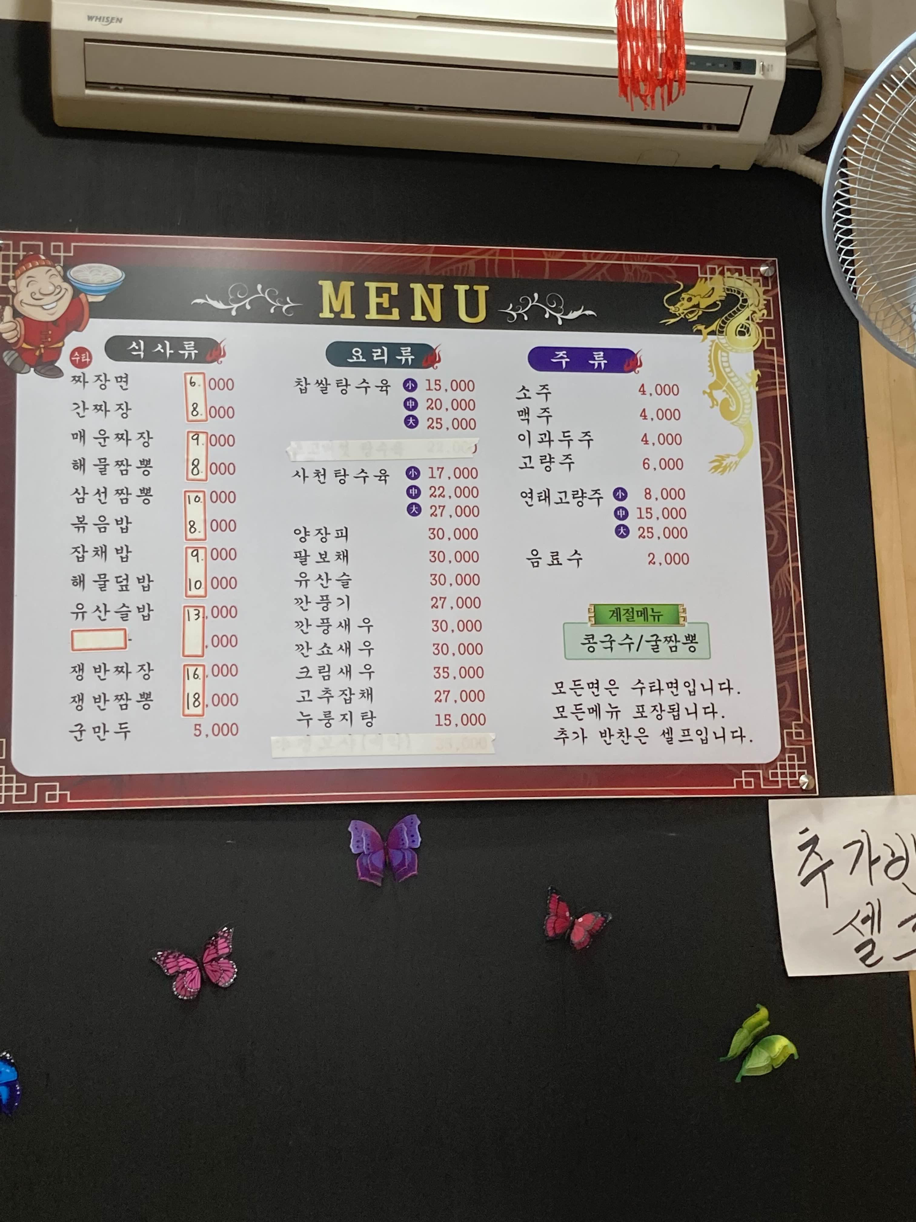 반찬: 김치는 중국산( 잘익어서 맛있습니다) 짜장면집애 김치도 직접담은거면 사기캐릭인거죠 ㅋㅋㅋ(게임용어로서 잘못만든 혹은 이질적인 혹은 실수로 만들어진 너무 좋게 만들어진 캐릭터를 뜻함)