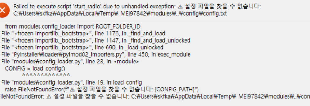 FileNotFoundError: 설정 파일을 찾을 수 없습니다: C:\Users\000\AppData\Local\Temp\_MEIxxxxx\...\config\config.txt