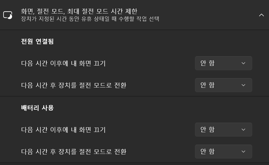 - "디스크 끄기", "화면 꺼짐", "절전모드" → 모두 "안 함" 설정