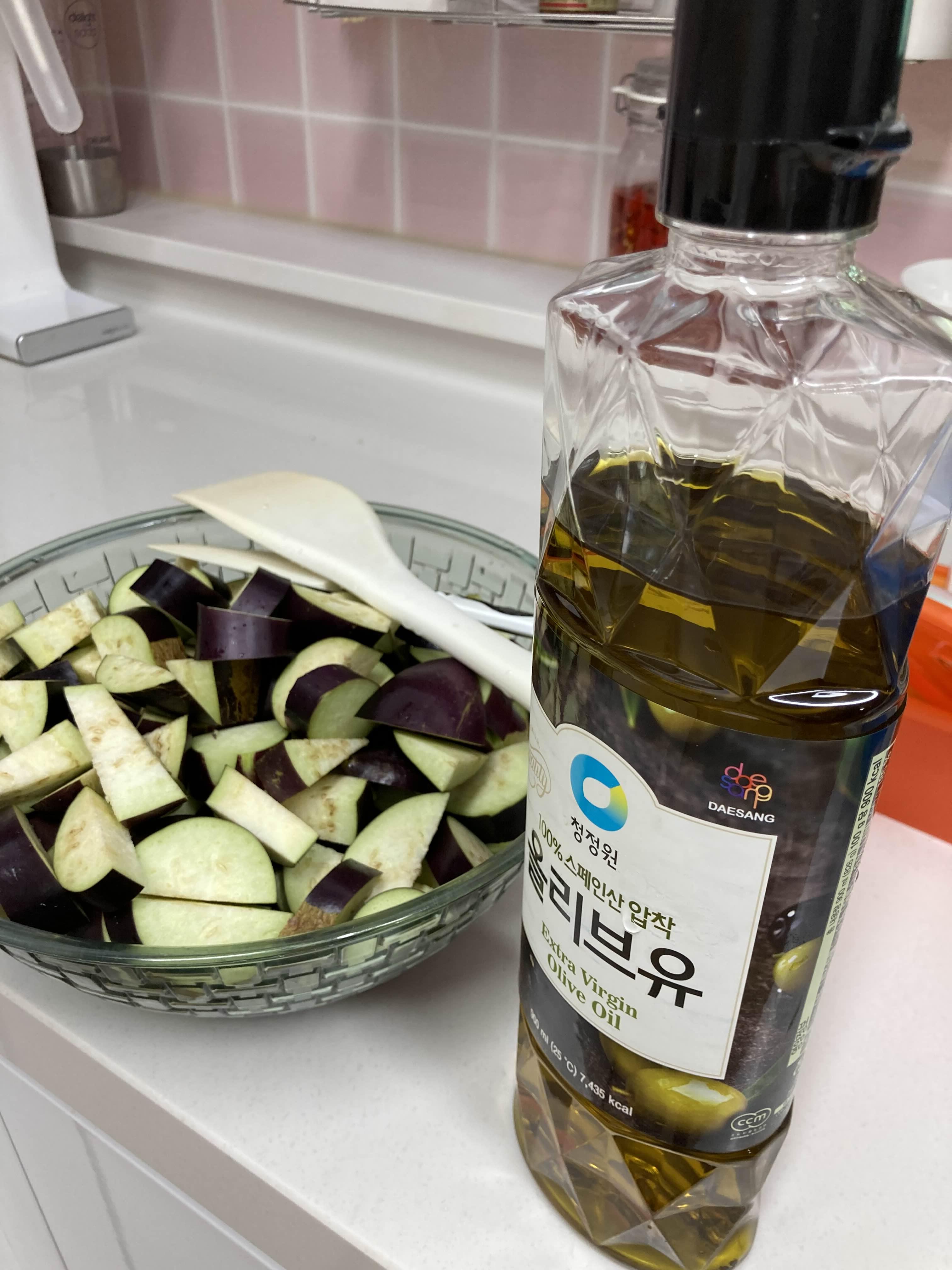 대충대충 썰어준 가지를 올리브유와 함께 준비합니다.