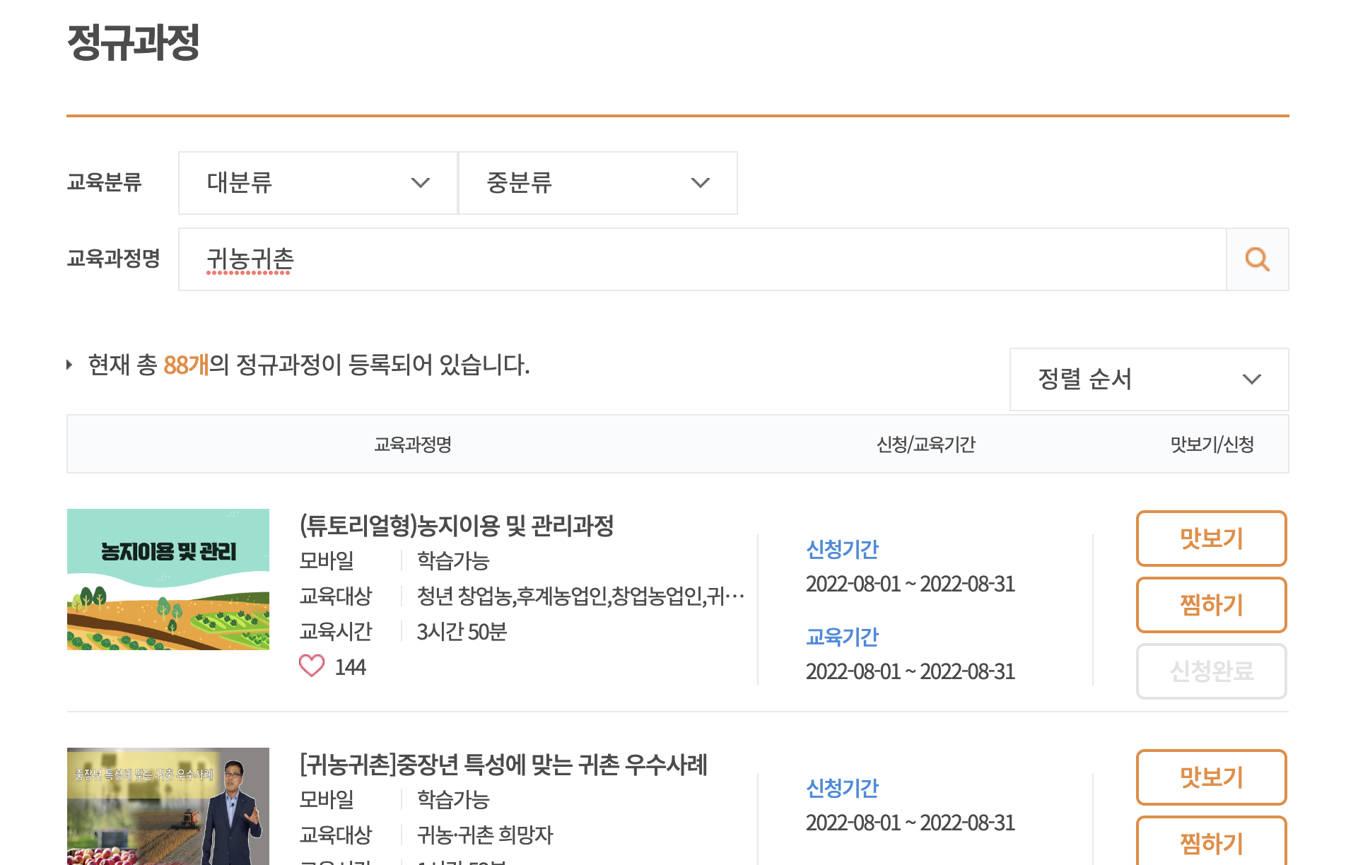 정규과정 중 "귀농귀촌" 이라고 검색하셔서 나오는 것들을 추천합니다.