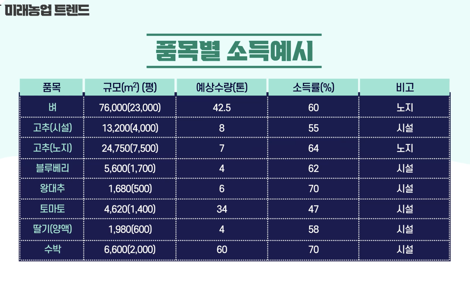 벼의 경우 23,000평에서 42.5톤의 수확이 나와야 5000만원의 소득 가능 이라고 보시면 됩니다.