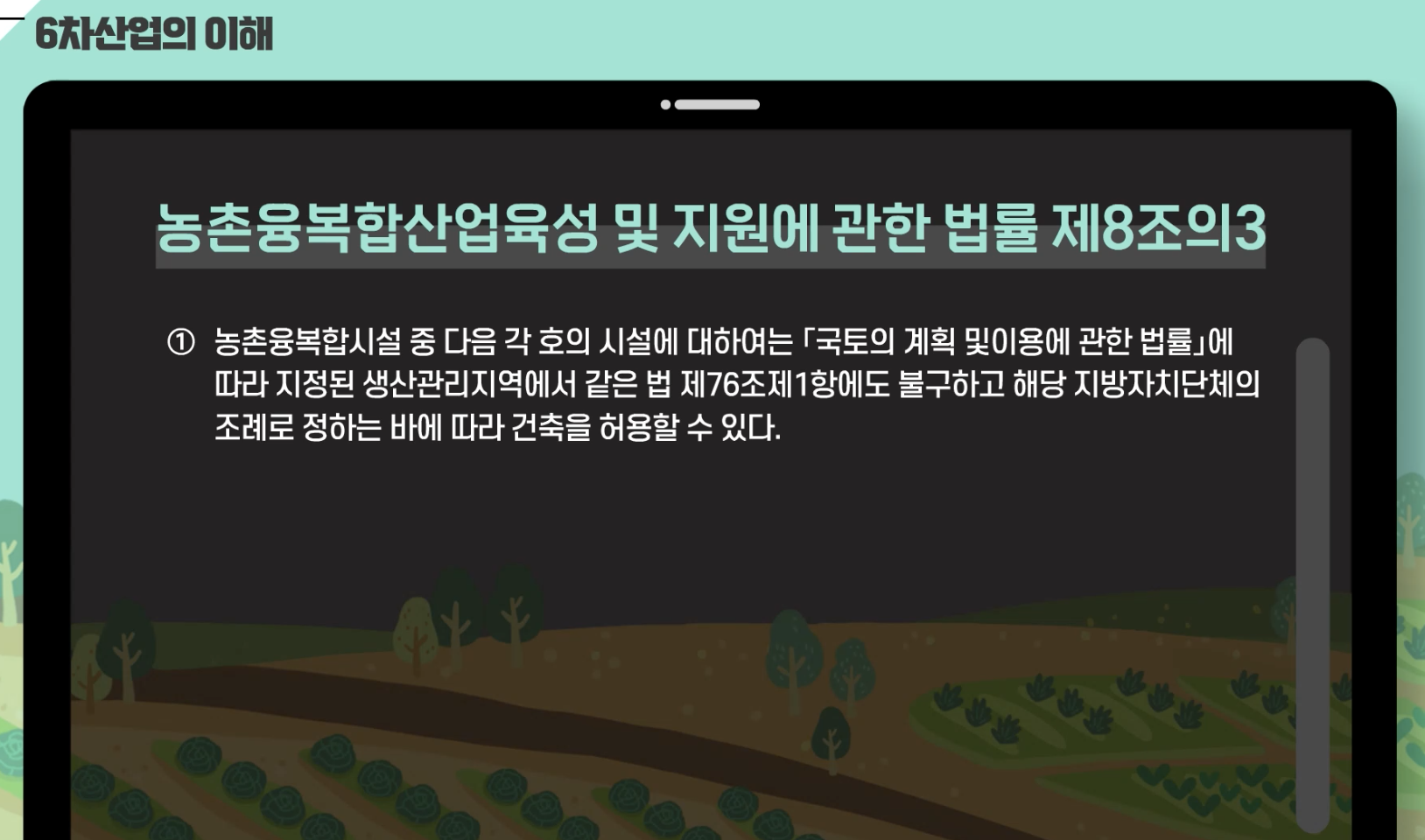 6차산업이란 농촌에 존재하는 모든 유무형의 자원을 바탕으로 농업과 식품, 특산품 제조·가공(2차산업) 및 유통·판매, 문화, 체험, 관광, 서비스(3차산업)등을 연계함으로서 새로운 부가가치를 창출하는 활동을 의미합니다. (체험장 등이 해당)