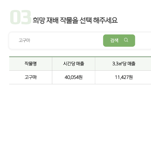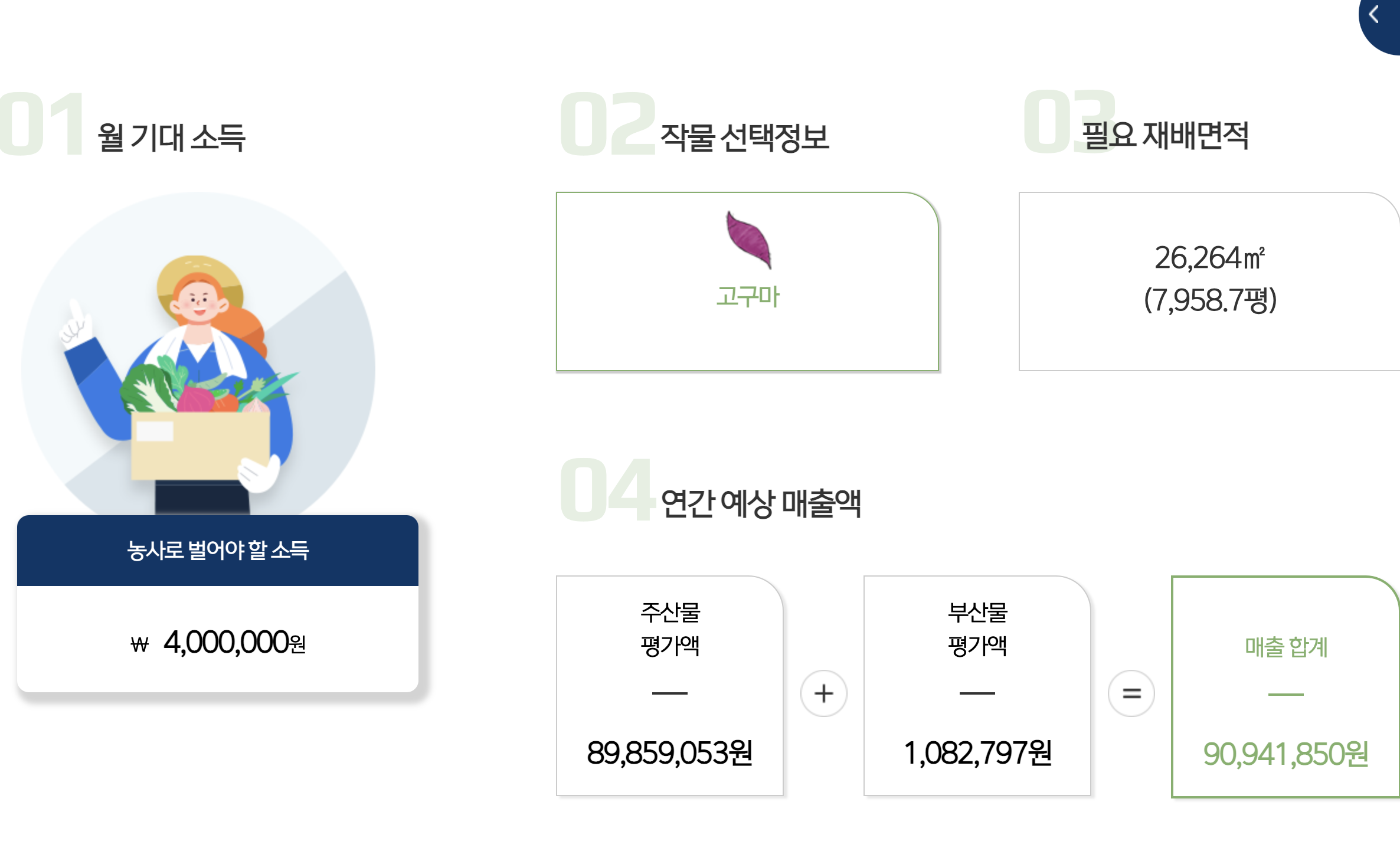 소규모 농업형태 , 월수입 평균 400만원, 희망작물 고구마를 선택했을 경우의