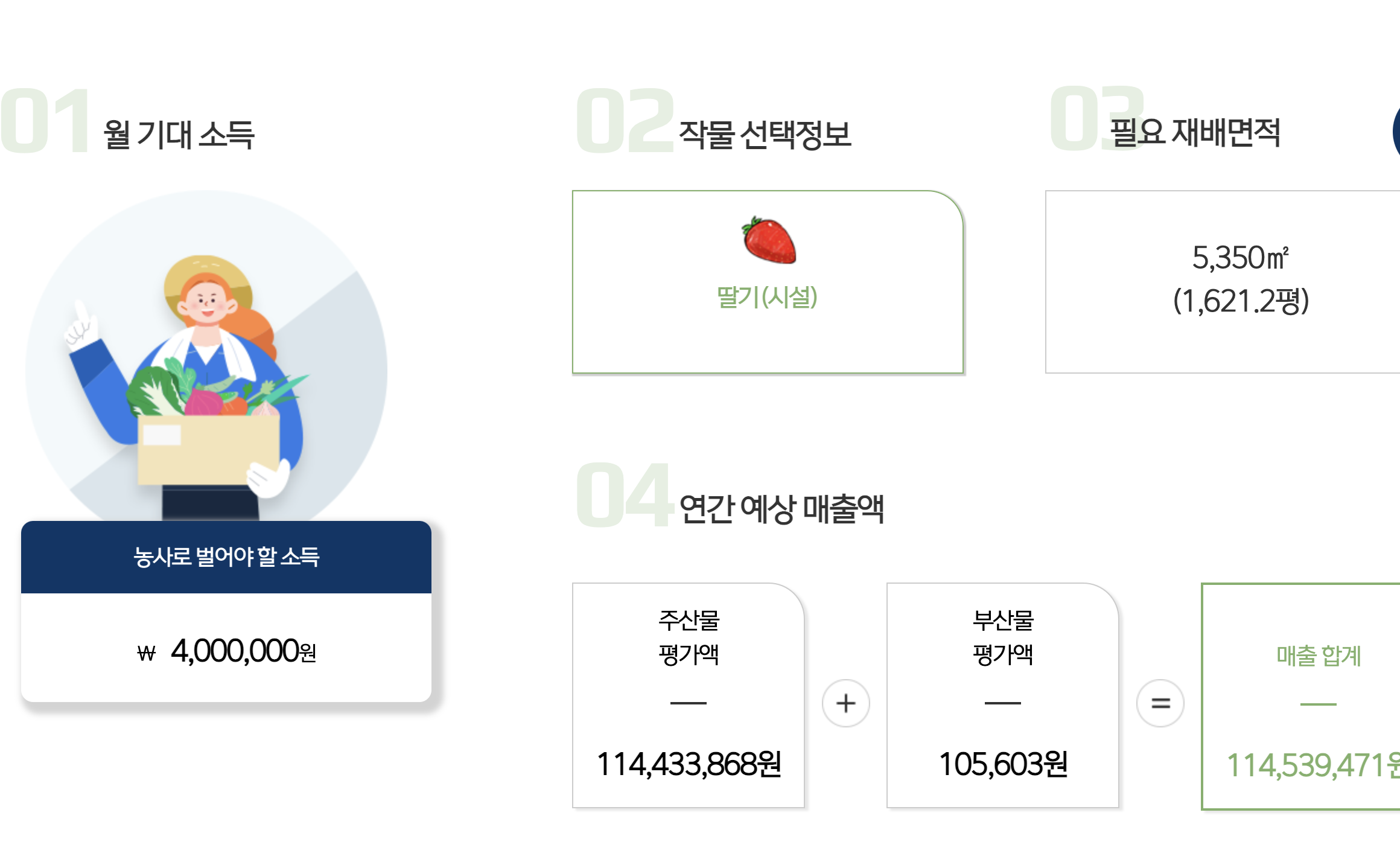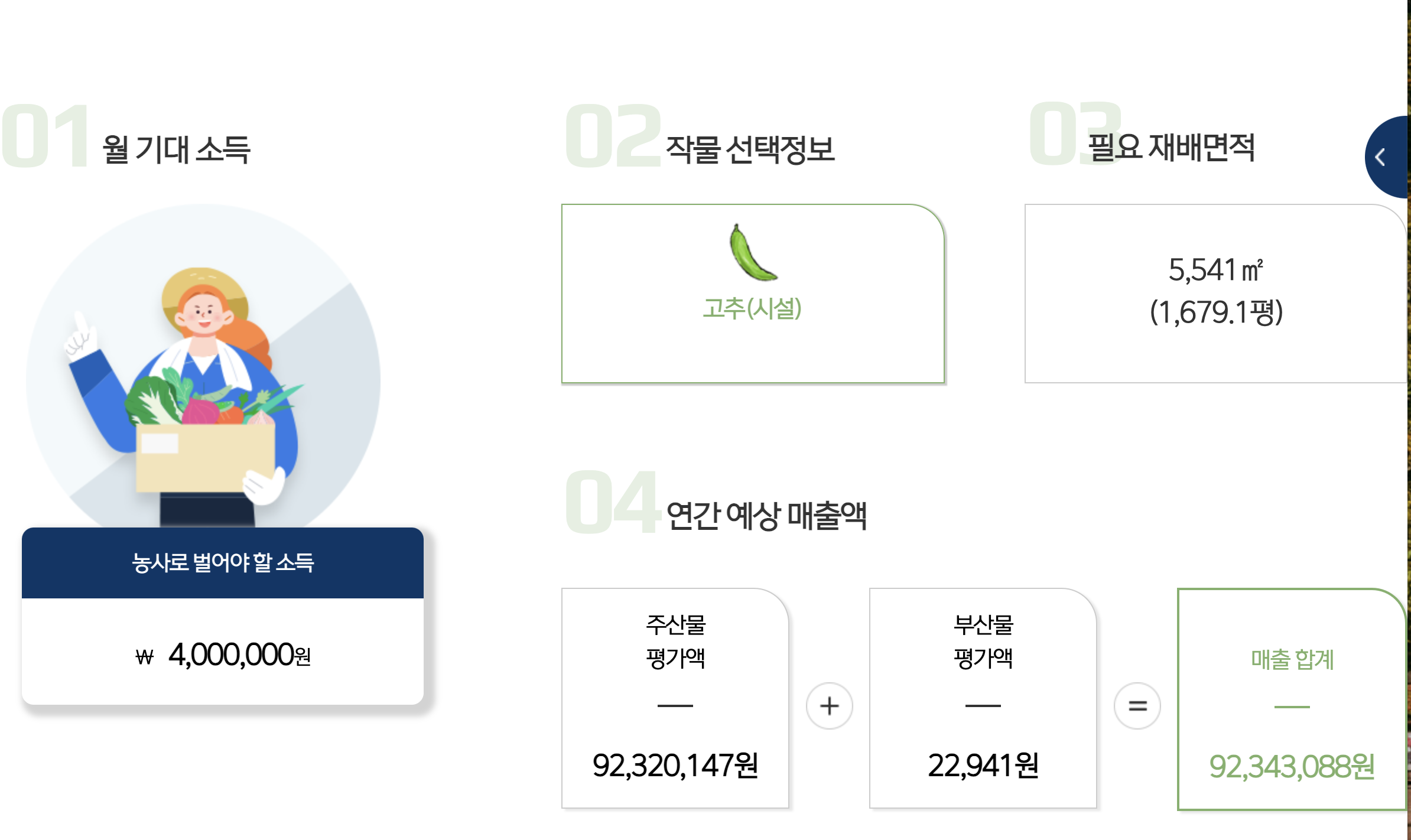 월기대소득에 대한 연간 예상 매출액, 필요 재배면적,예상 경영비 세부내역을 확인할 수 있다.