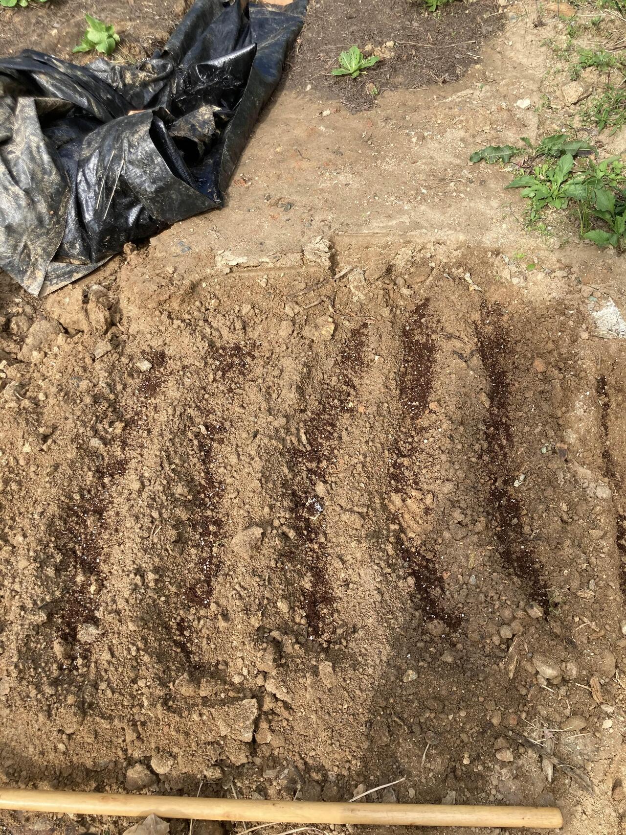 두둑에 10센티 간격으로 고랑을 만들고 줄뿌리기를 한다.